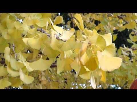 公孫樹(いちょう)科。学名 Ginkgo biloba Ginkgo : イチョウ属 biloba : 二浅裂Ginkgo は、日本名「銀杏(ぎんなん)」の音読みのギンキョウ"がもとになっており、さらに"ギンキョウ"のつづり「Ginkjo」を「Ginkgo」と誤植したことで、今の属名「Ginkgo」になった。 黄色の紅葉がきれい。葉っぱは扇形で切れ込みがある。 イチョウ並木中国原産。昔、留学僧が持ち帰って広まったらしい。「公」は祖父の尊称。 祖父がタネをまいても、実がなるのは孫の代になることから「公孫樹」。 「銀杏」とも書く。「銀杏」は唐音で「インキャウ」と読み、それが「イキャウ」となりしだいに「イチョウ」になった。★葉っぱが色づくわけ<簡単説明>秋になり日光が弱くなり、気温が低くなると、葉っぱのつけねのところに壁ができてきて、葉っぱから枝の方に養分が流れなくなり、そのため赤や黄色に変わって<複雑な説明>木々は冬に近づくと、葉を落とす準備のために葉と枝との間にしきり(離層)を作り、そのため、葉っぱのところで光合成でできた糖分は枝に回らずに葉の中にたまっていく。一方、気温が低くなると葉の緑色の色素(クロロフィルが壊れてきて、その下に隠れていた黄色の色素(カロチノイド)が表面に出てくる。公孫樹(いちょう)などがこの種類に該当する。また葉に取り残された糖分は赤色の色素(アントシアン)に変わっていき、それが目立つのがカエデやモミジなどの種類である。 公孫樹(いちょう)など